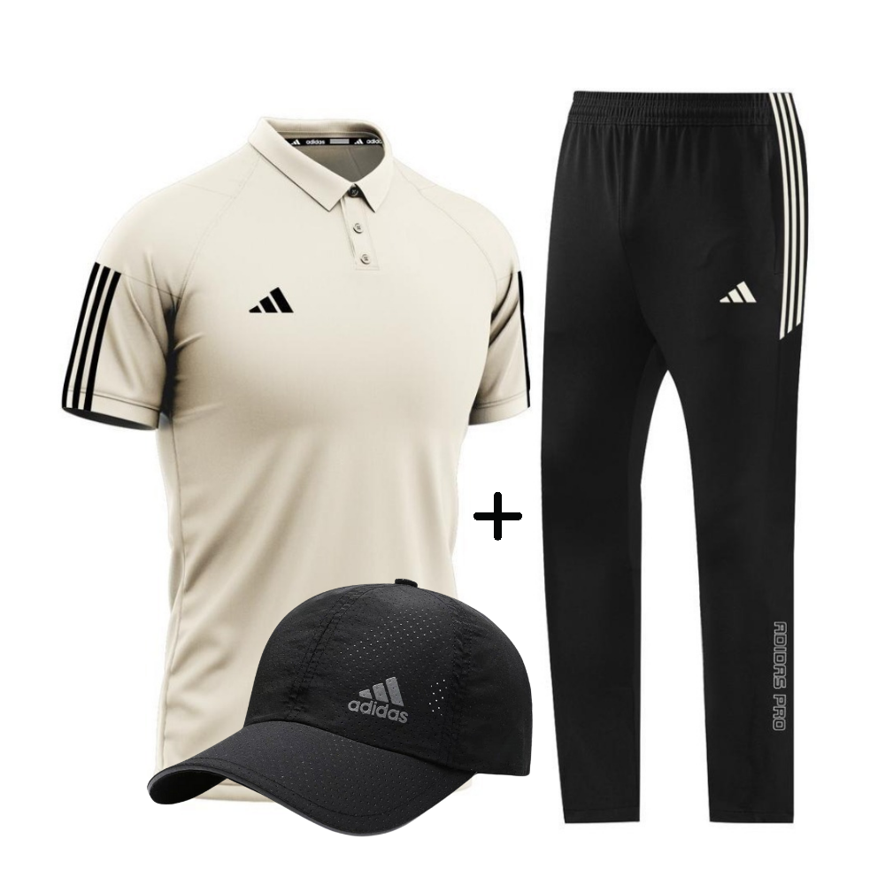 Ensemble Adidas Homme – Polo Beige, Pantalon Noir et Casquette
