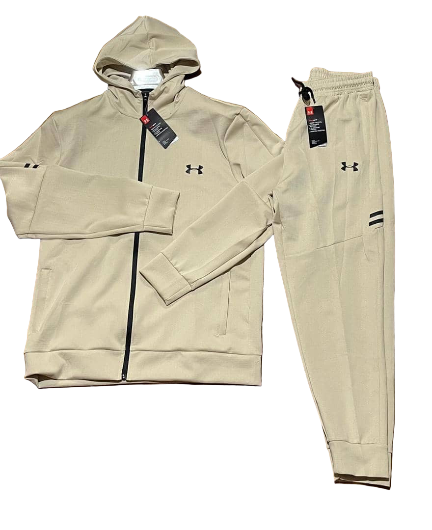 Adopte un look à la fois sportif et élégant avec cet ensemble Under Armour noir composé d’une veste à capuche zippée et d’un pantalon assorti.