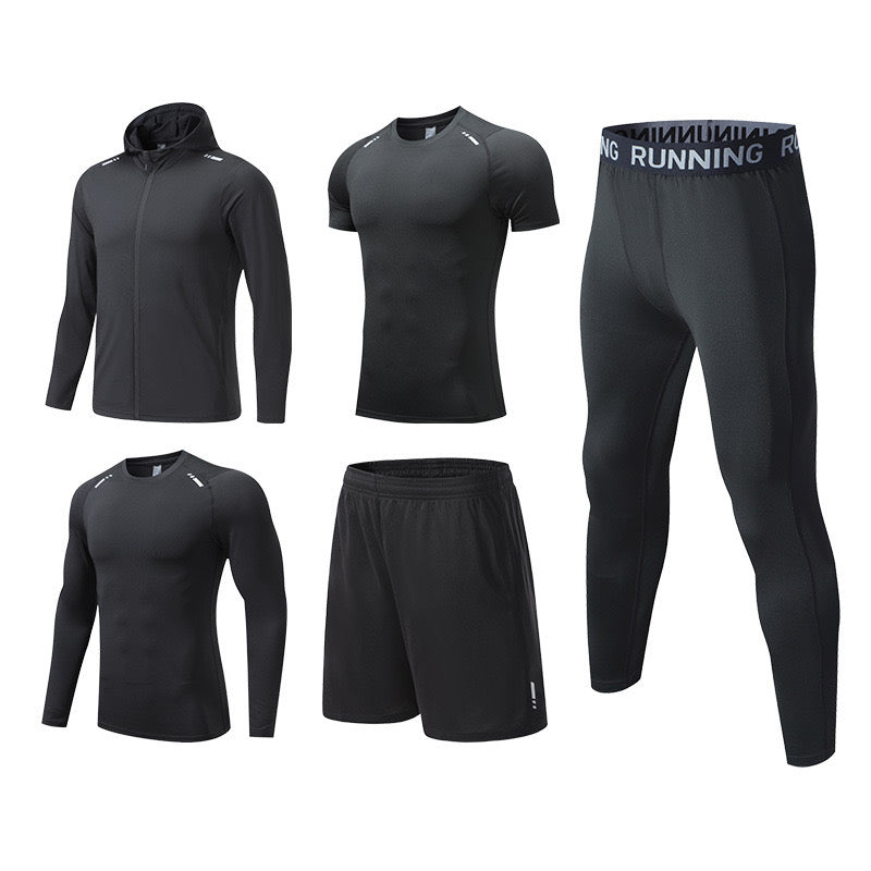Ce pack complet comprend 5 pièces : un t-shirt à manches courtes, un t-shirt à manches longues, une veste à capuche zippée, un short et un legging de compression. Conçu pour les activités sportives intenses comme la musculation, le running ou le fitness, cet ensemble offre confort, légèreté et respirabilité.